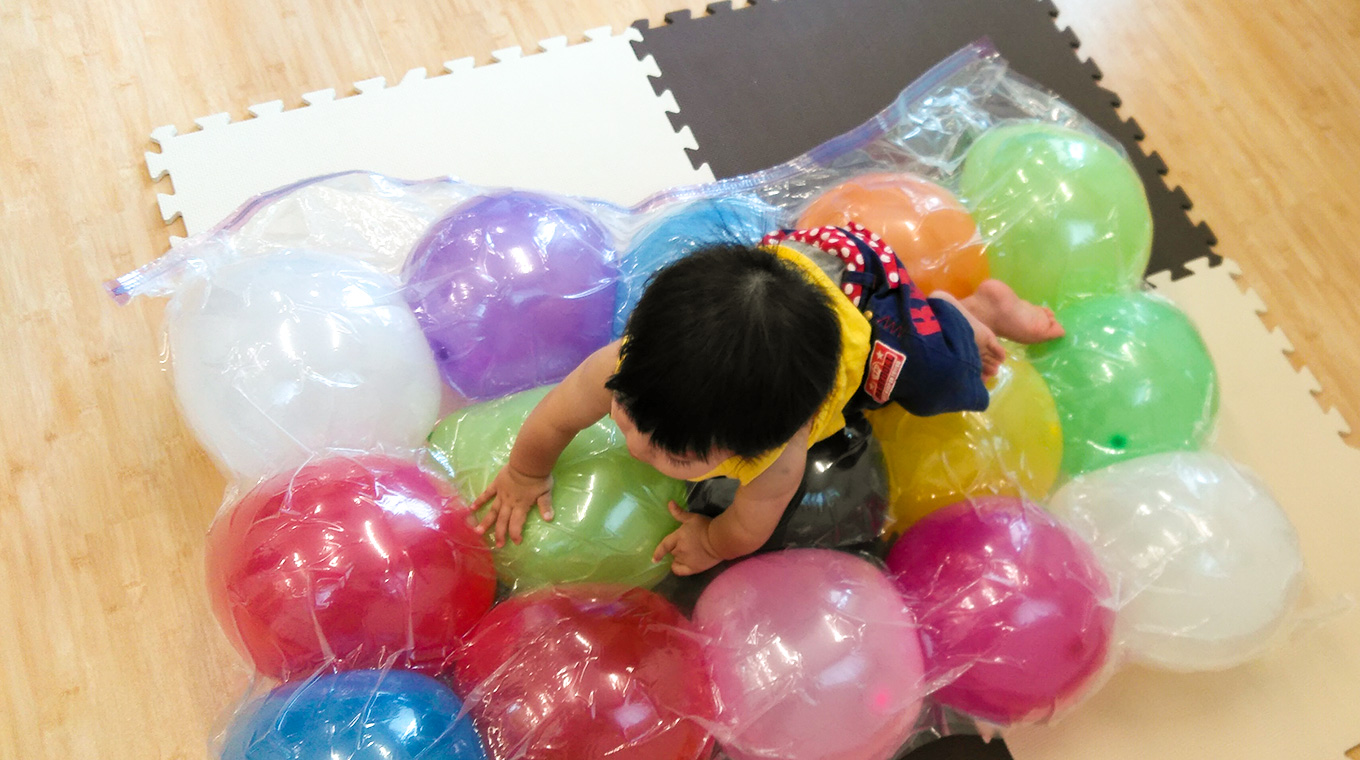 風船に貼った絵をマッチングさせる宝探し、飛ばした風船を捕まえる風船キャッチ、風船バレー、たくさんの風船をふとん圧縮袋に詰めて作った風船ベッドなど。身体を使うことで、療育にもつながります。